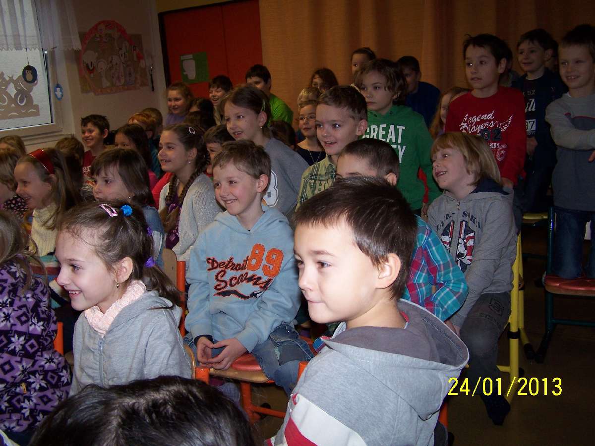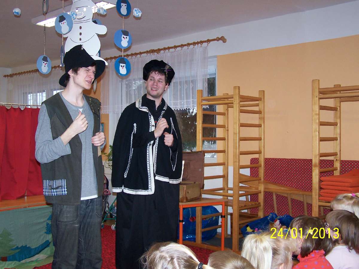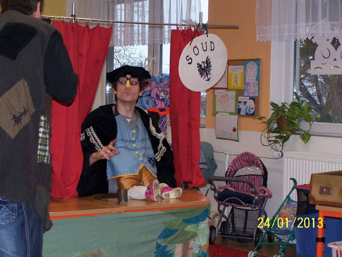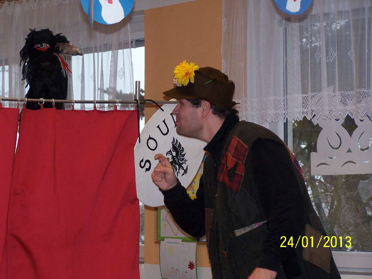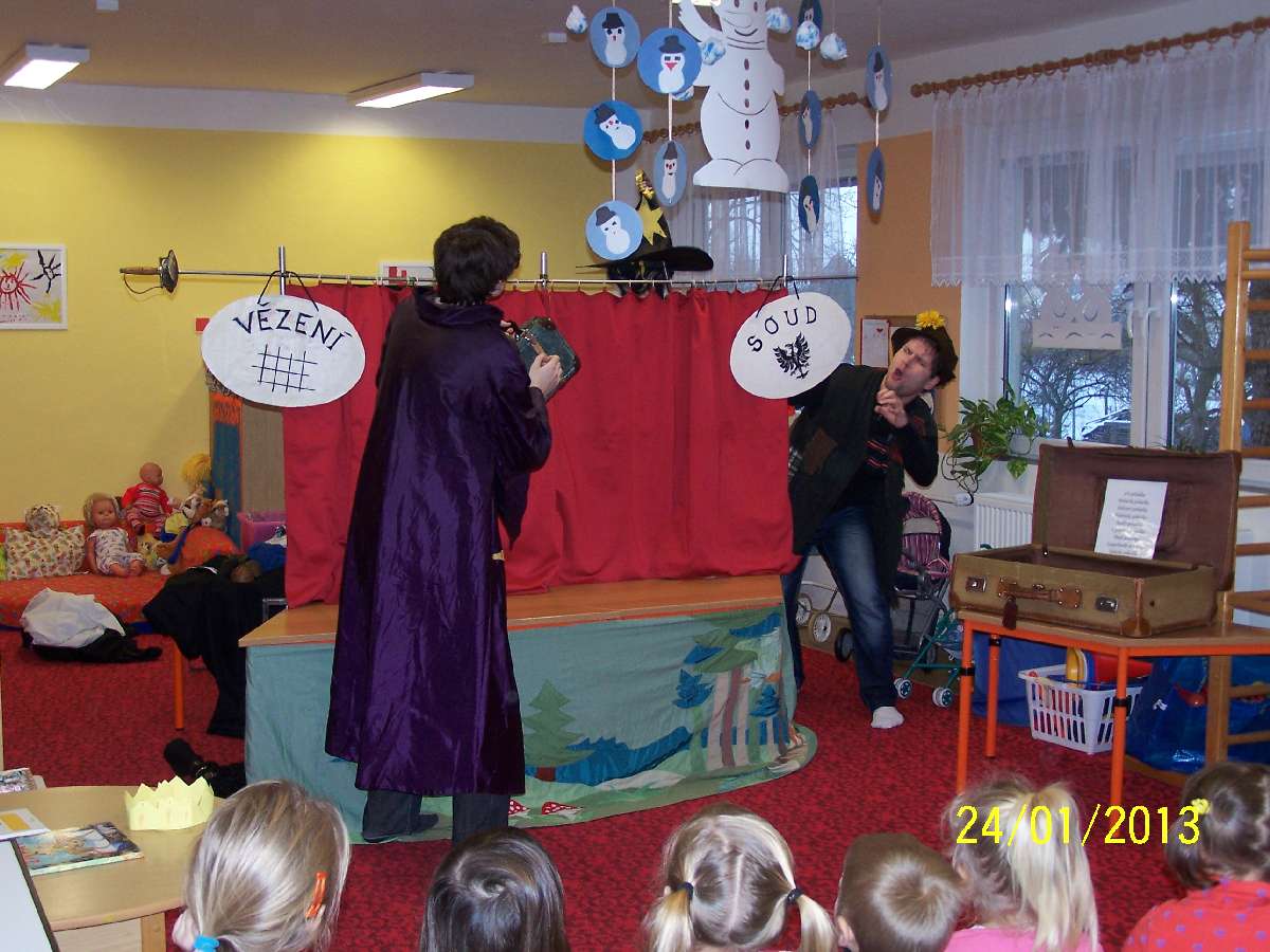 Ve čtvrtek 24. ledna se prvňáci, druhách a třeťáci vypravili do mateřské školy, aby všichni společně zhlédli představení Divadélka Karla Čapka z Hradce Králové. Hrály se pohádky ze známé Čapkovy knížky Devatero pohádek. Děti si vybraly pomocí kouzelných karet dvě pohádky – Tuláckou pohádku a Loupežnickou pohádku. Roztomilá byla loutka malého loupežníka Lotrandíka, který byl převychován v poctivého člověka. Pohádky hráli dva herci, kteří dokázali měnit postavy a jejich charaktery za pomoci převleků. Pohádky byly humorné, nepostrádaly fantazii a krásnou češtinu. Představení se dětem velmi líbilo.
