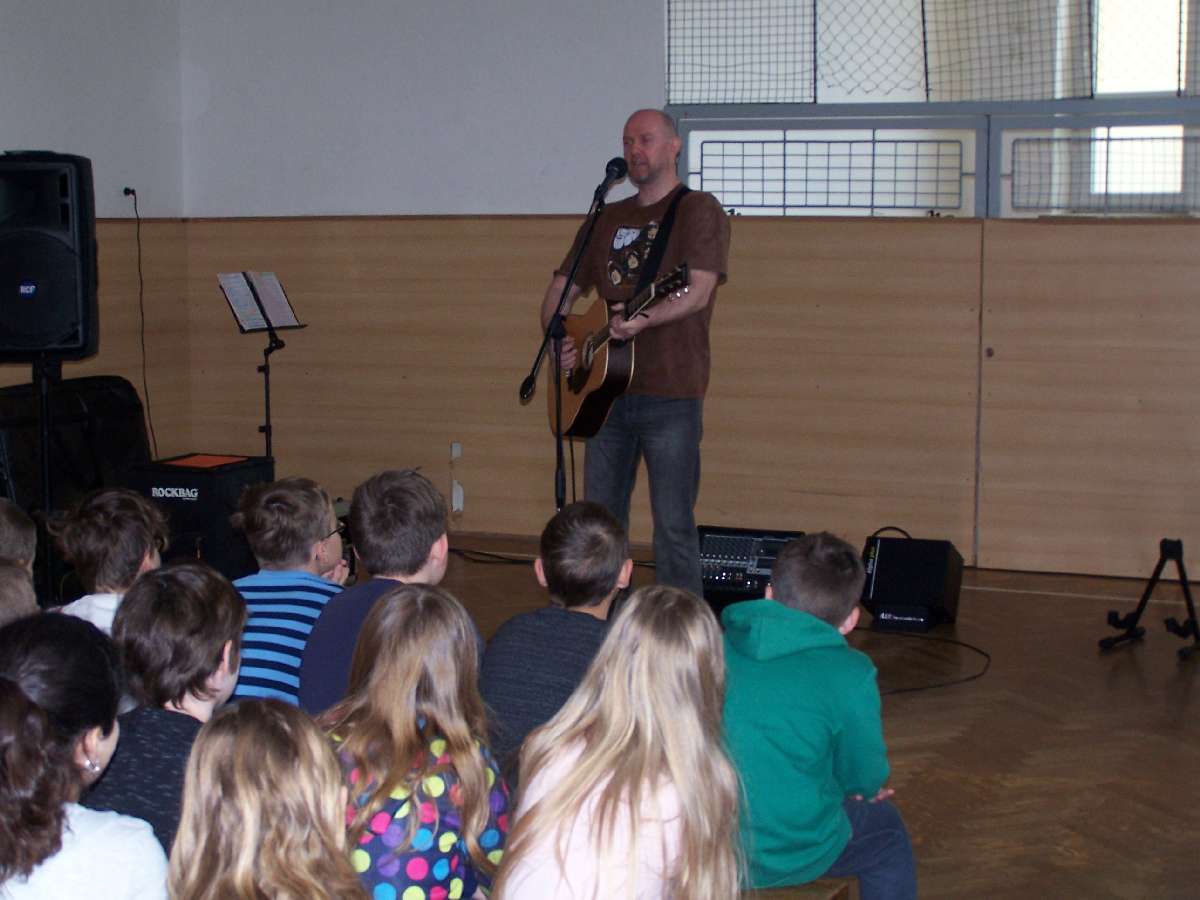 Ve středu 12. 4. jsme šli první hodinu do tělocvičny na koncert. Zpočátku jsem čekala, že to bude nějaká kapela, ale až jsme tam přišli, stál tam jen jeden pán. Říkala jsem si, co že to bude, ale na to, že tam stál úplně sám, to byla pecka. Zazpívali jsme si písničky od Jaromíra Nohavici nebo od Jana Nedvěda. Koncert se mi moc líbil, pán byl příjemný a vybral si oblíbené písně. Jediný problém byl opět chování některých spolužáků. (Ema Benadová)