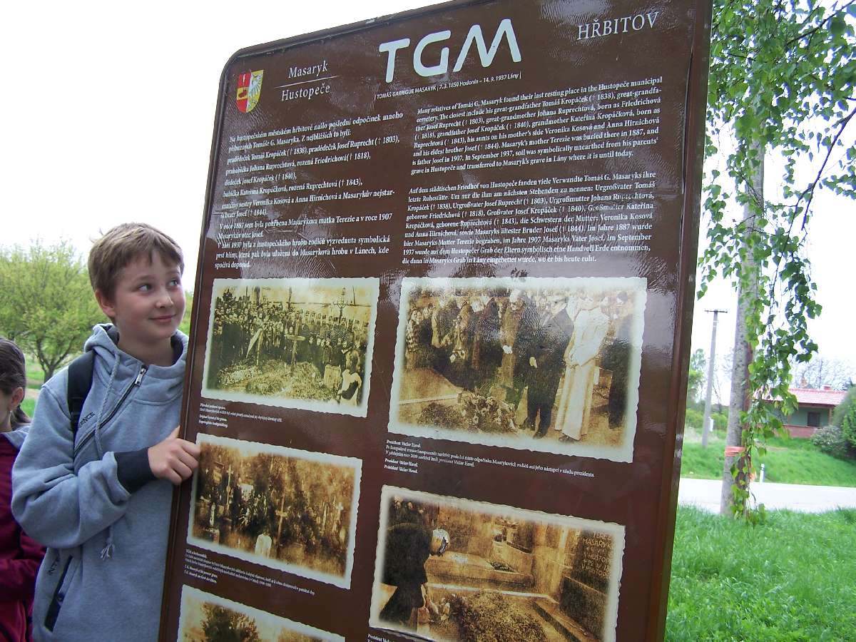 Dne 5. 5. jsme jeli se třídou do Hustopečí na naučnou stezku TGM. Dozvěděli jsme se, na jakou školu TGM chodil (byla to reálka, což je nižší gymnázium). Dále jsme se dozvěděli, kde je hrob jeho rodiny, kde bydlel… Myslím, že měli někteří spolužáci raději zůstat doma a nekazit to těm, kteří se o to zajímali a chtěli si z toho něco odnést. Program by se mi moc líbil, kdyby to někteří nekazili. (Patrik Rusek)